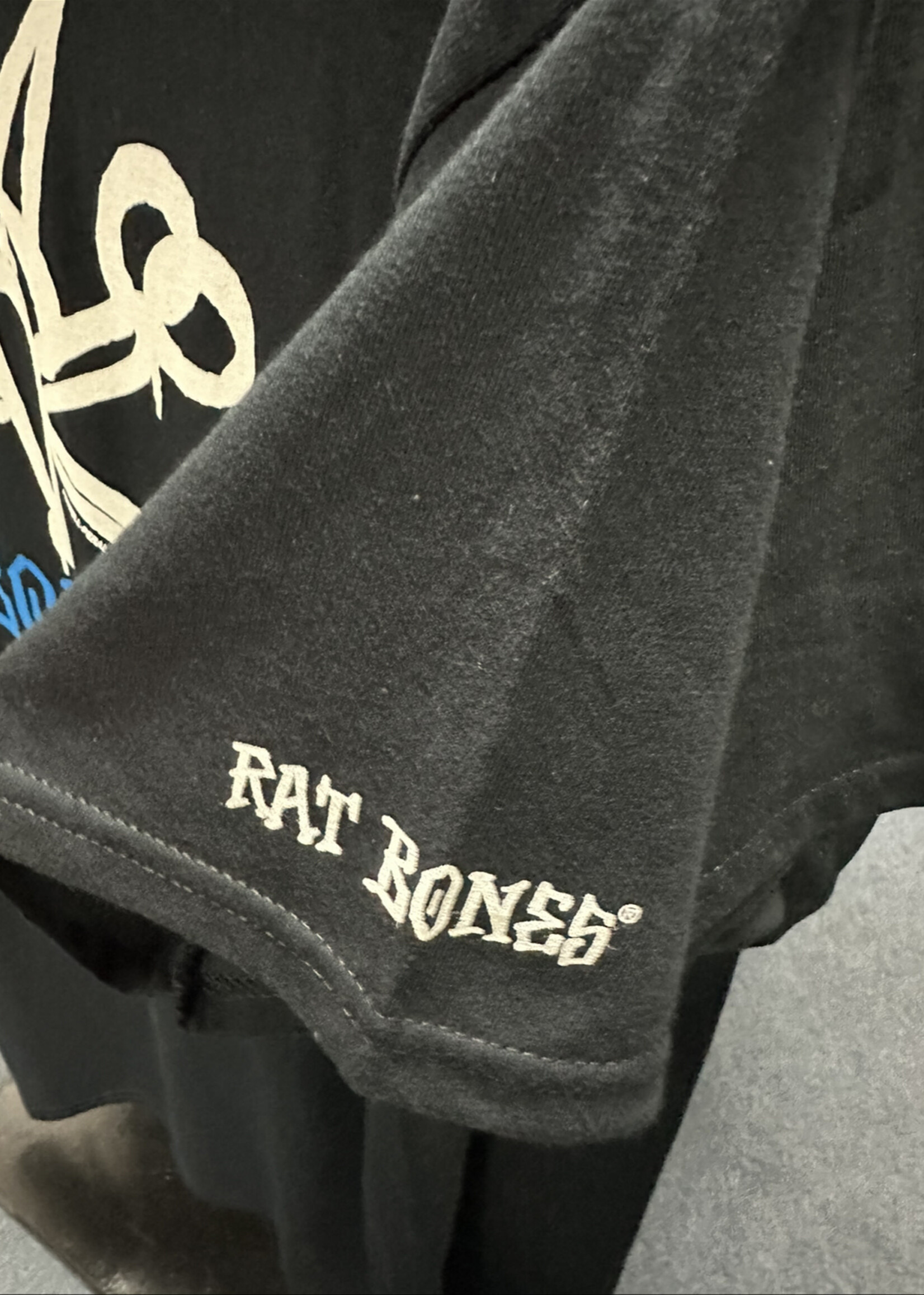 Black Bones Vato Rat Tee Shirt. Small front print, large back print, plus a sleeve print, in white & blue